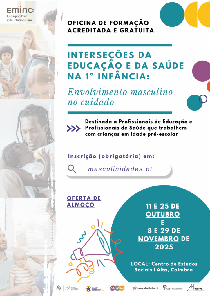 Esta ação de formação, enquadrada no âmbito do Projeto EMINC | Envolvimento Masculino em Iniciativas de Cuidado, atualmente em curso no Centro de Estudos Sociais da Universidade de Coimbra, baseia-se no reconhecimento da importância de paternidades envolvidas e cuidadoras e de uma divisão equitativa das responsabilidades de cuidar e educar as crianças entre os seus principais cuidadores e cuidadoras para o desenvolvimento saudável das crianças (sobretudo durante a primeira infância). Neste sentido, torna-se essencial capacitar profissionais de saúde e de educação, enquanto agentes de socialização por excelência de crianças desde os primeiros anos de vida, com estratégias que lhes permitam fomentar um maior envolvimento dos pais/figuras masculinas de referência no cuidado das crianças.